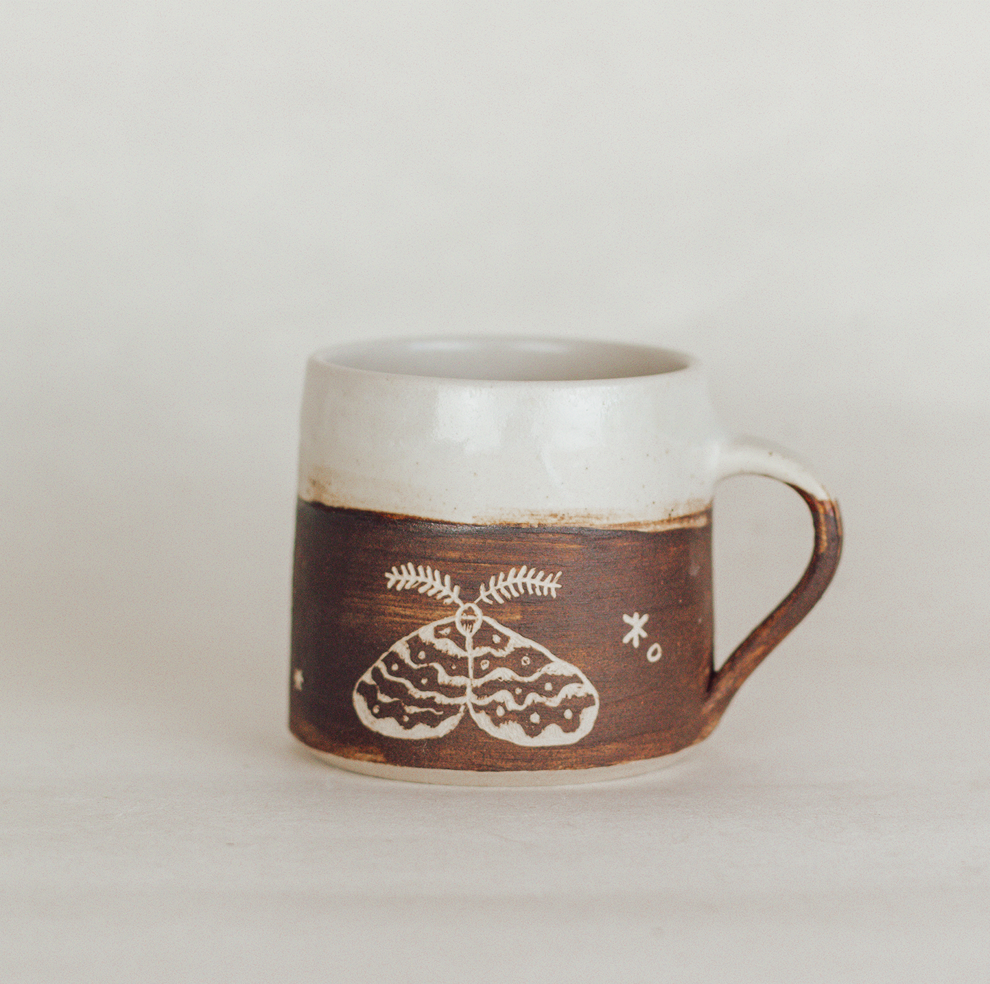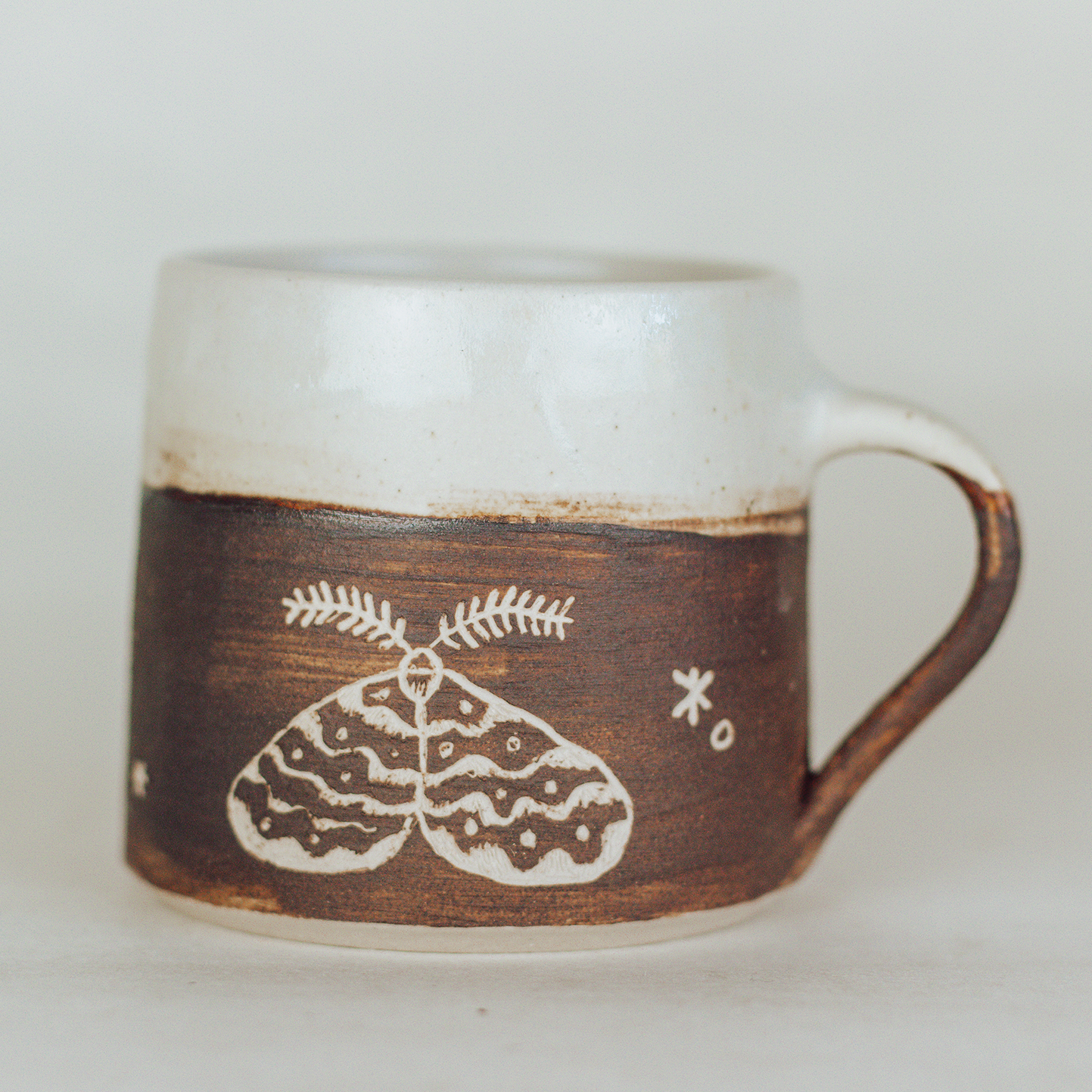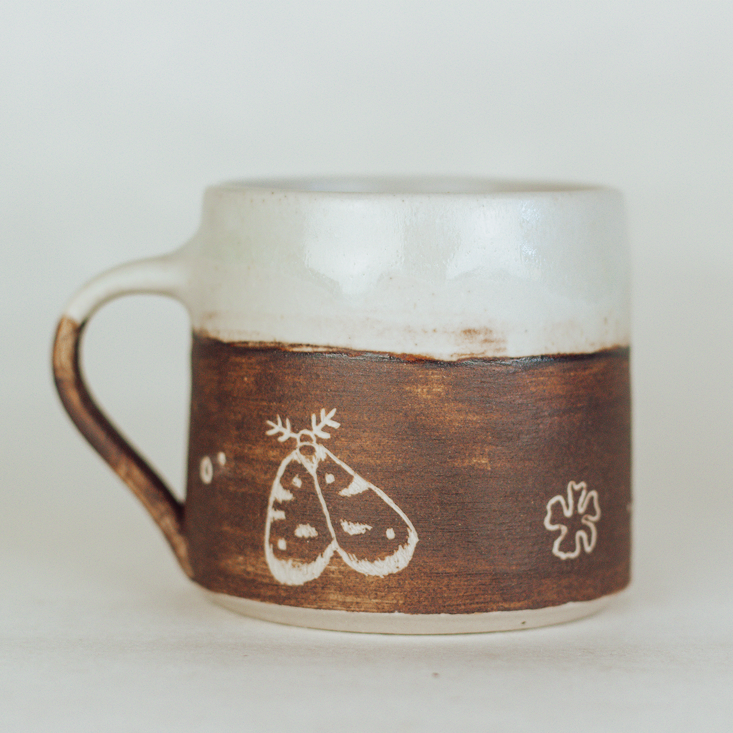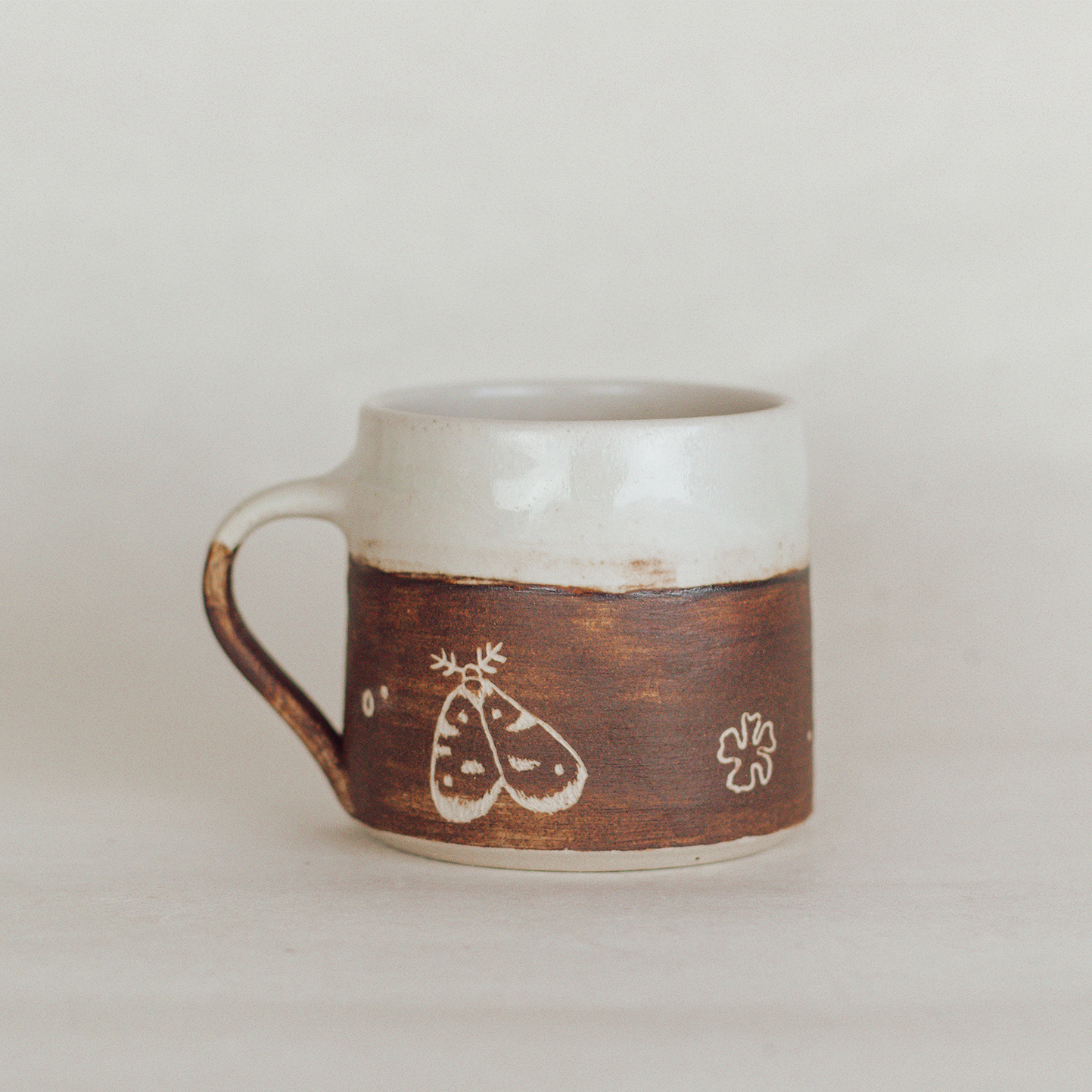 This handmade ceramic mug features delicate moth designs carved using the sgraffito technique, revealing the white clay beneath a warm brown brushed base. The top is dipped in a soft matte white glaze, while the clear glossy interior and rim make every sip smooth.