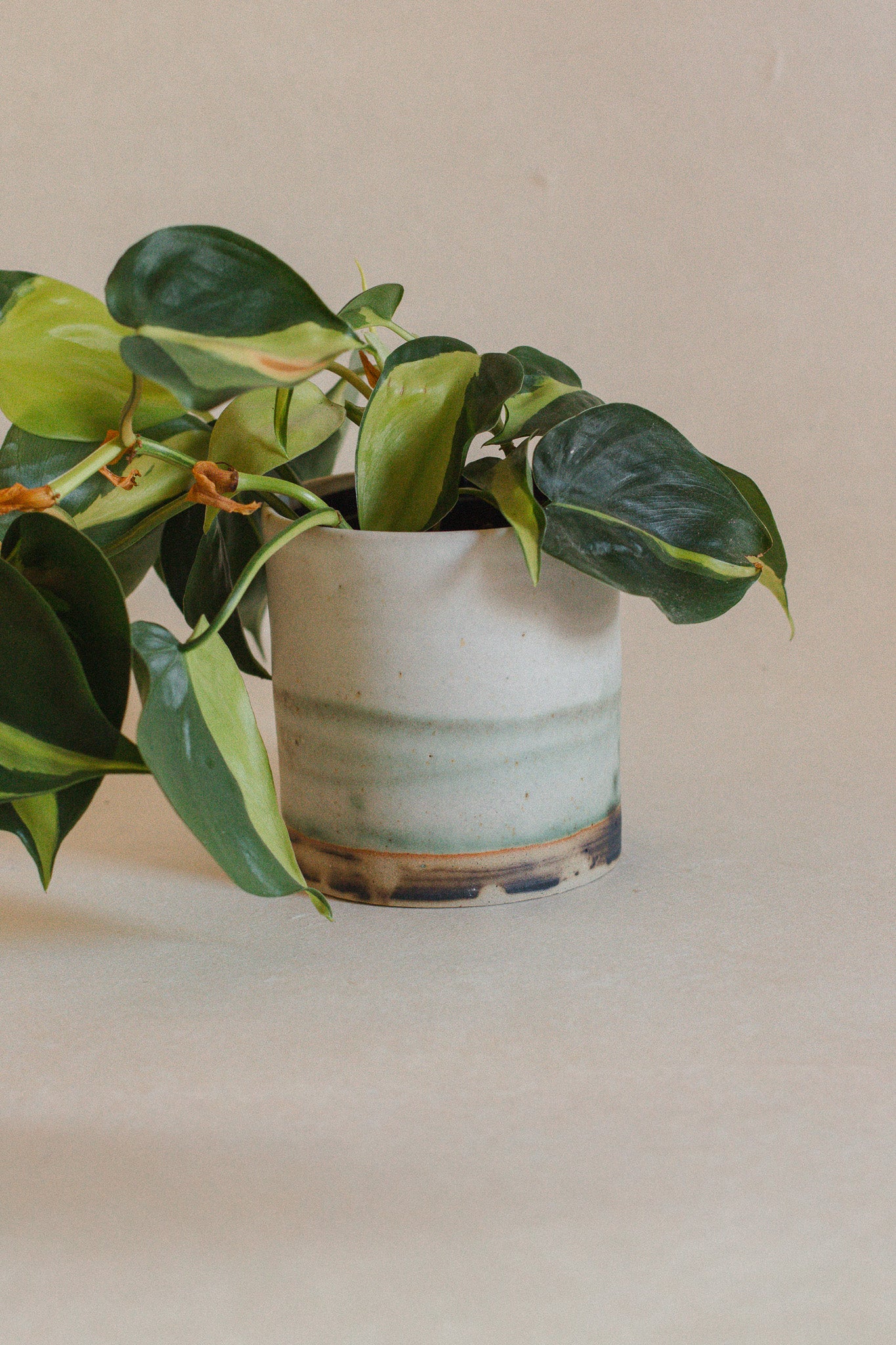 Handmade ceramic plant pot with copper oxide brushed base and matte white glaze. Perfect for displaying your favourite houseplants and elevating your interior décor. Unique artisan pottery piece with natural earthy tones.