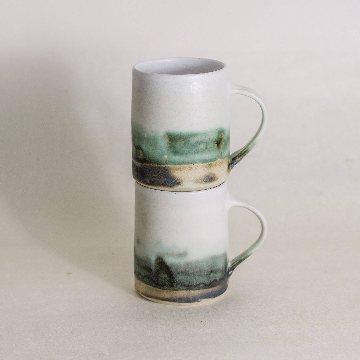 This handmade ceramic mug is brushed with a copper oxide that blends with a soft matte white glaze. The inside and rim are coated in a smooth, glossy clear glaze for a more comfortable drinking experience