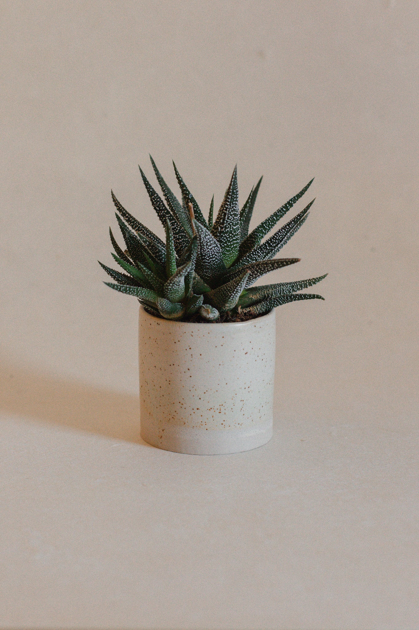 Add a touch of subtle charm to your plants with this mini plant pot. Its creamy, speckled eggshell-like glaze gives it a soft, natural look that complements any greenery. Perfect for small succulents, cacti, or tiny herbs, this handmade pot measures 6.5 cm in diameter and 6.3 cm in height.