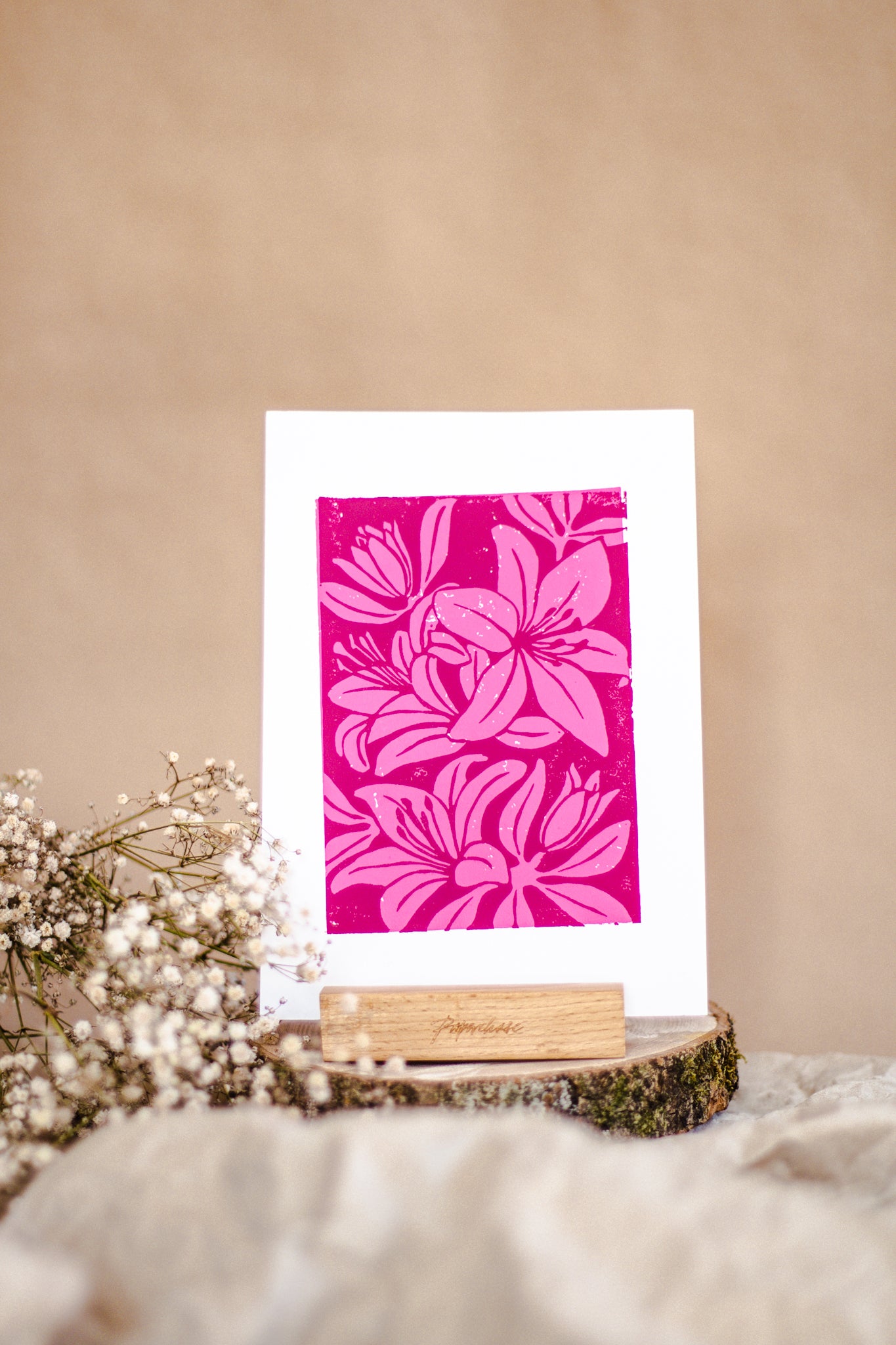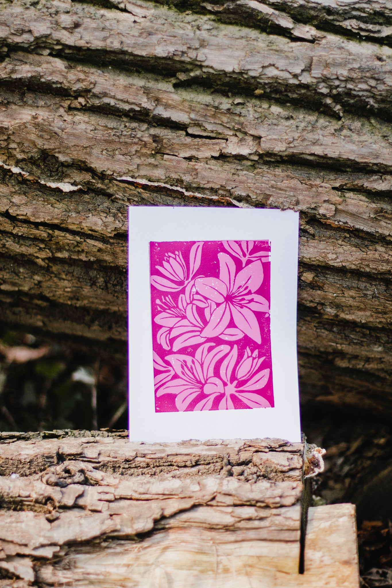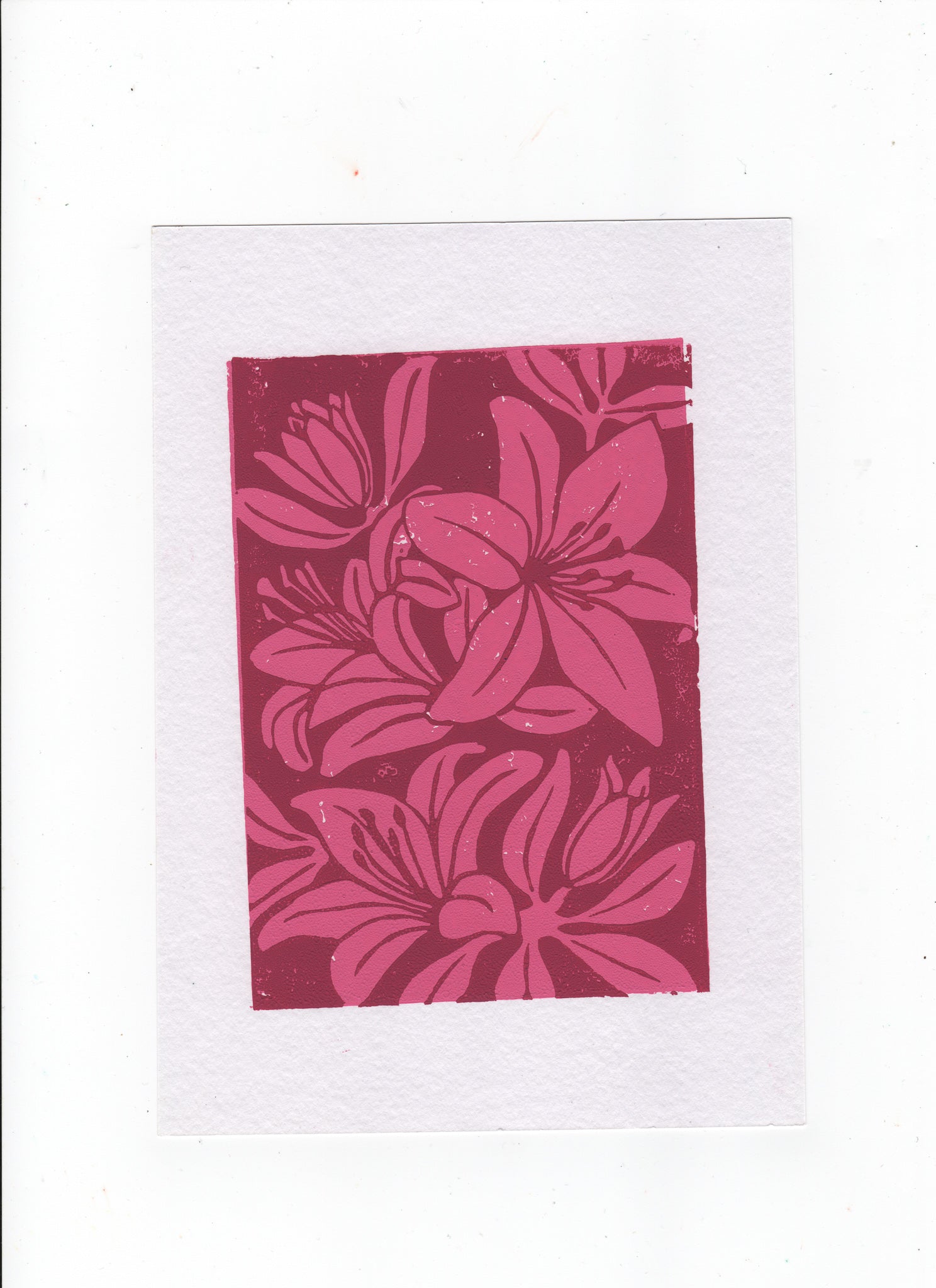 Printed on 200gsm white textured card paper with two shades of pink Jackson's Water-based Lino Ink. Dimensions: 15x21cm
