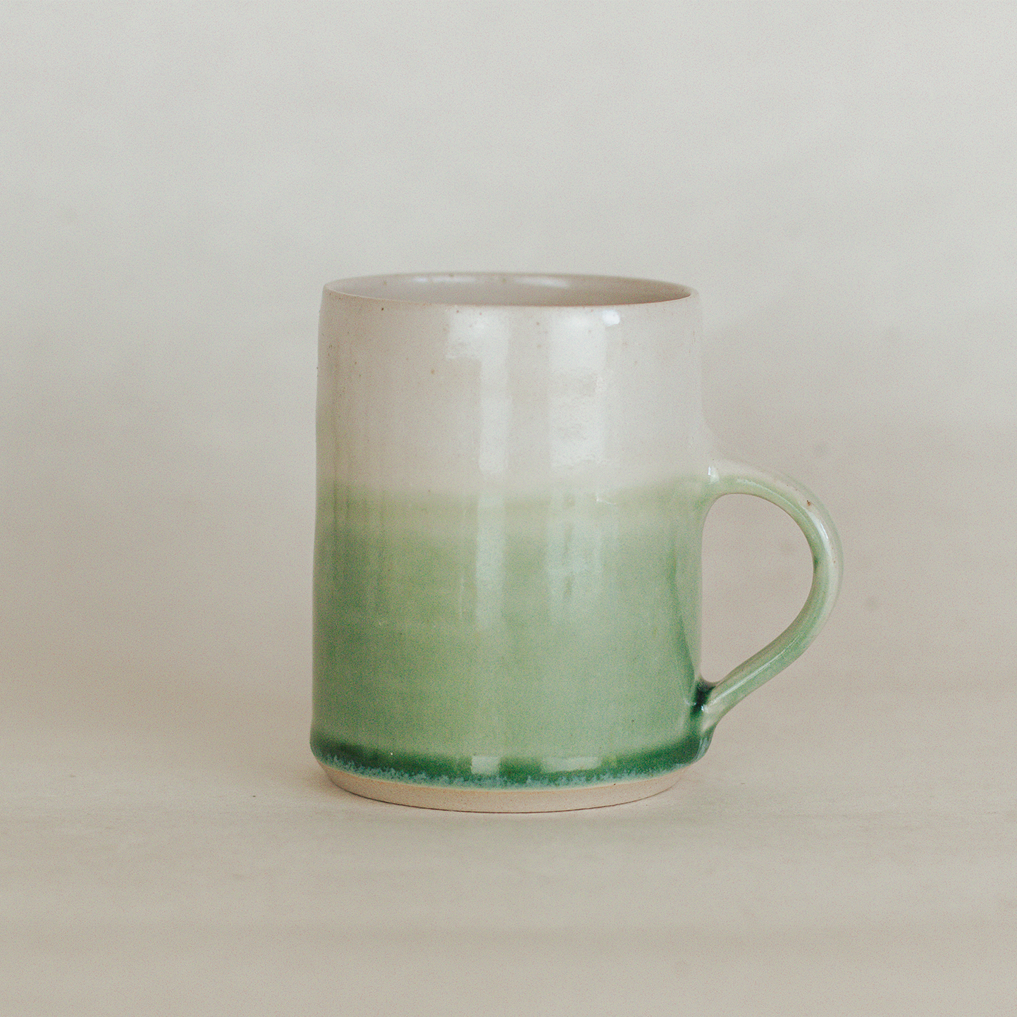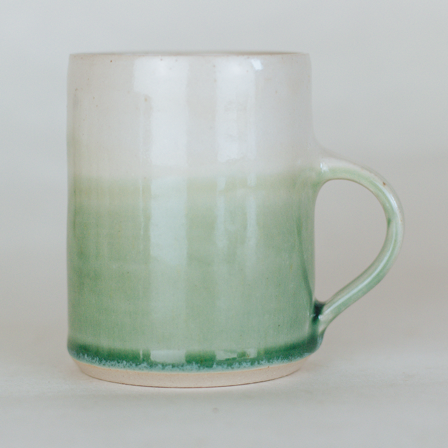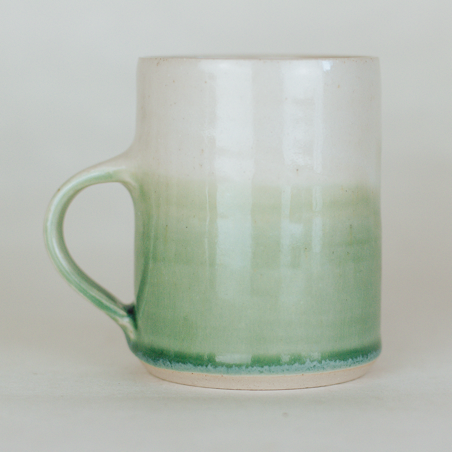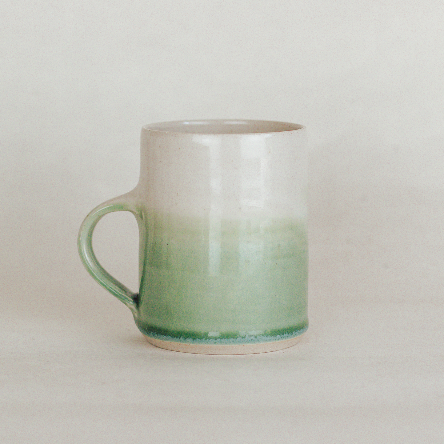 This handmade ceramic mug has a base that is glazed in a glossy green-blue, fading into a shiny white top and interior for a serene, ocean-inspired look.